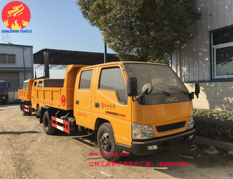 我公司生產的江鈴公路養護車是一款雙排座自卸車,該車實用性強,性價比高,是一款適用于公路養護作業的理想用車型。主要配置為江鈴雙排駕駛室,3360mm軸距,江鈴115馬力國五發動機,7.00R16LT鋼絲胎,油剎,5檔箱,排氣制動,原廠ABS。上裝部分主要由液壓系統、操作系統組成。舉升油缸為雙頂油缸,箱體標配邊3底4mm。